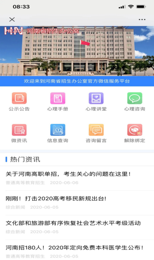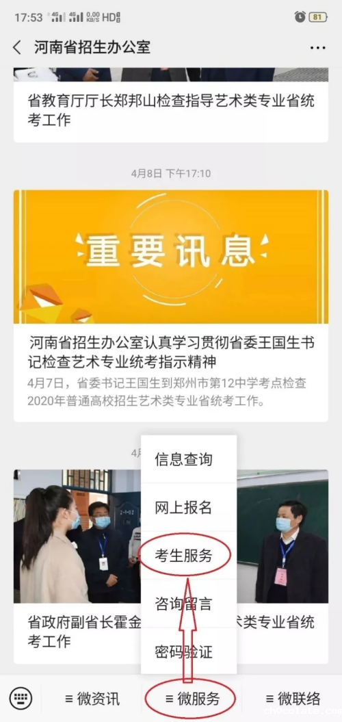 进入“河南省招生办公室”微信公众号,点击下方菜单栏,选择【微服务】->【考生服务】绑定考生信息。