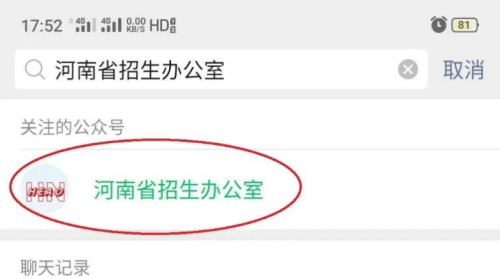 2、微信搜索“河南省招生办公室” 微信公众号并关注。